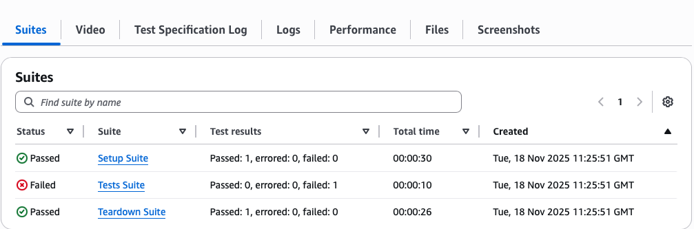 Even though Device Farm completes the run in about 1 minute, the results show: